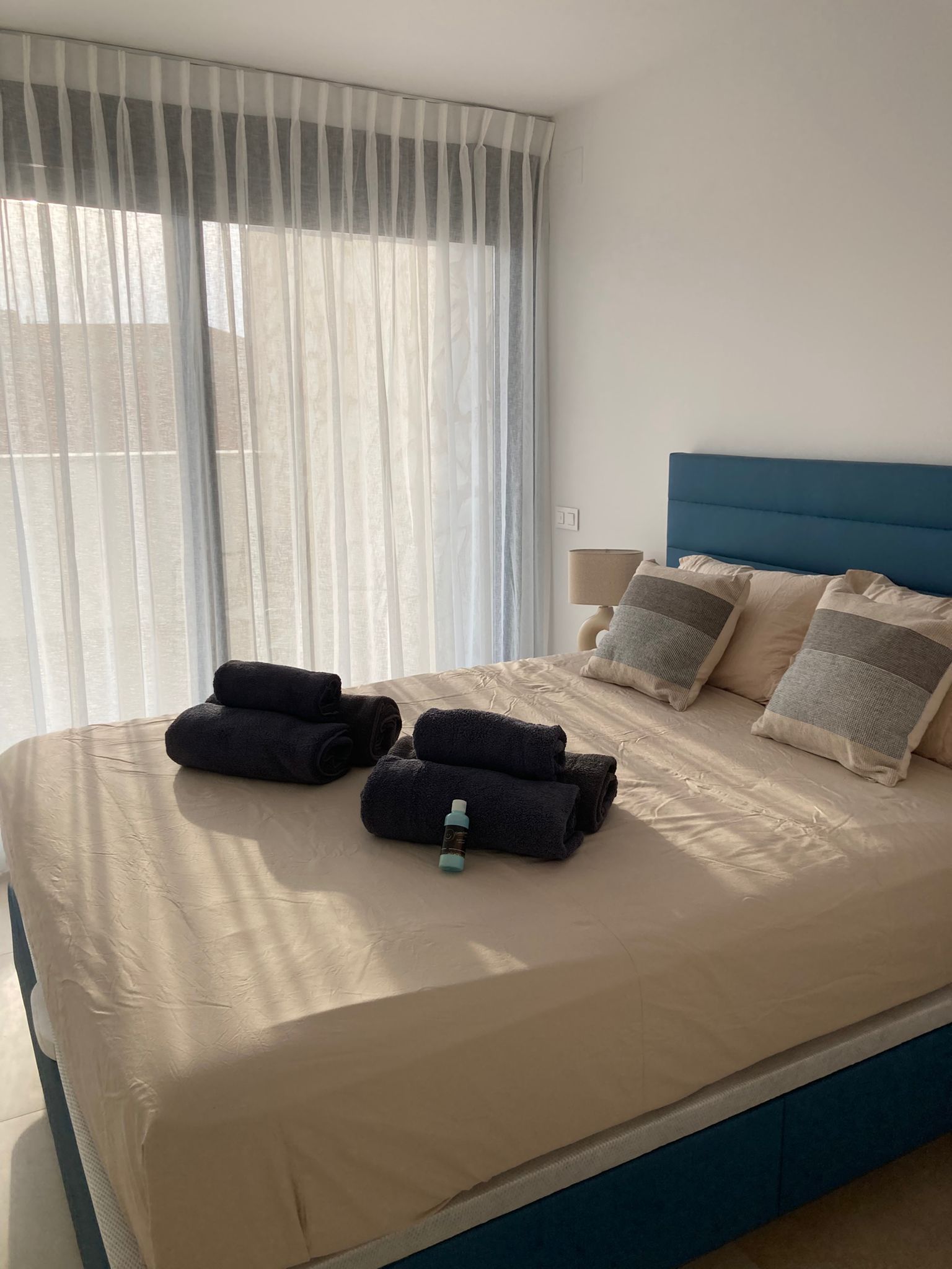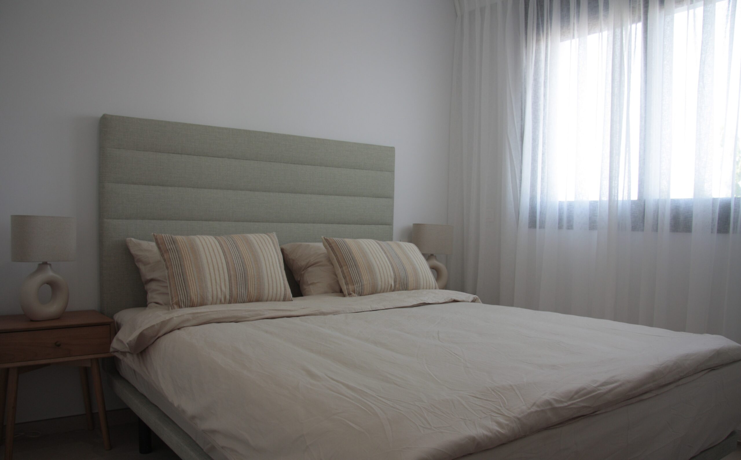 Ook de tweede slaapkamer op de bovenverdieping van 10 m² is stijlvol en comfortabel ingericht. Ook hier staat een tweepersoonsbed (160 x 200) met nachtkastjes en is airconditioning aanwezig. In de ingebouwde kastruimte kunt u uw kleding netjes opbergen en vindt u een moderne Dyson steelstofzuiger. Ook deze kamer is voorzien van stijlvolle gordijnen en elektrisch bedienbare rolluiken.