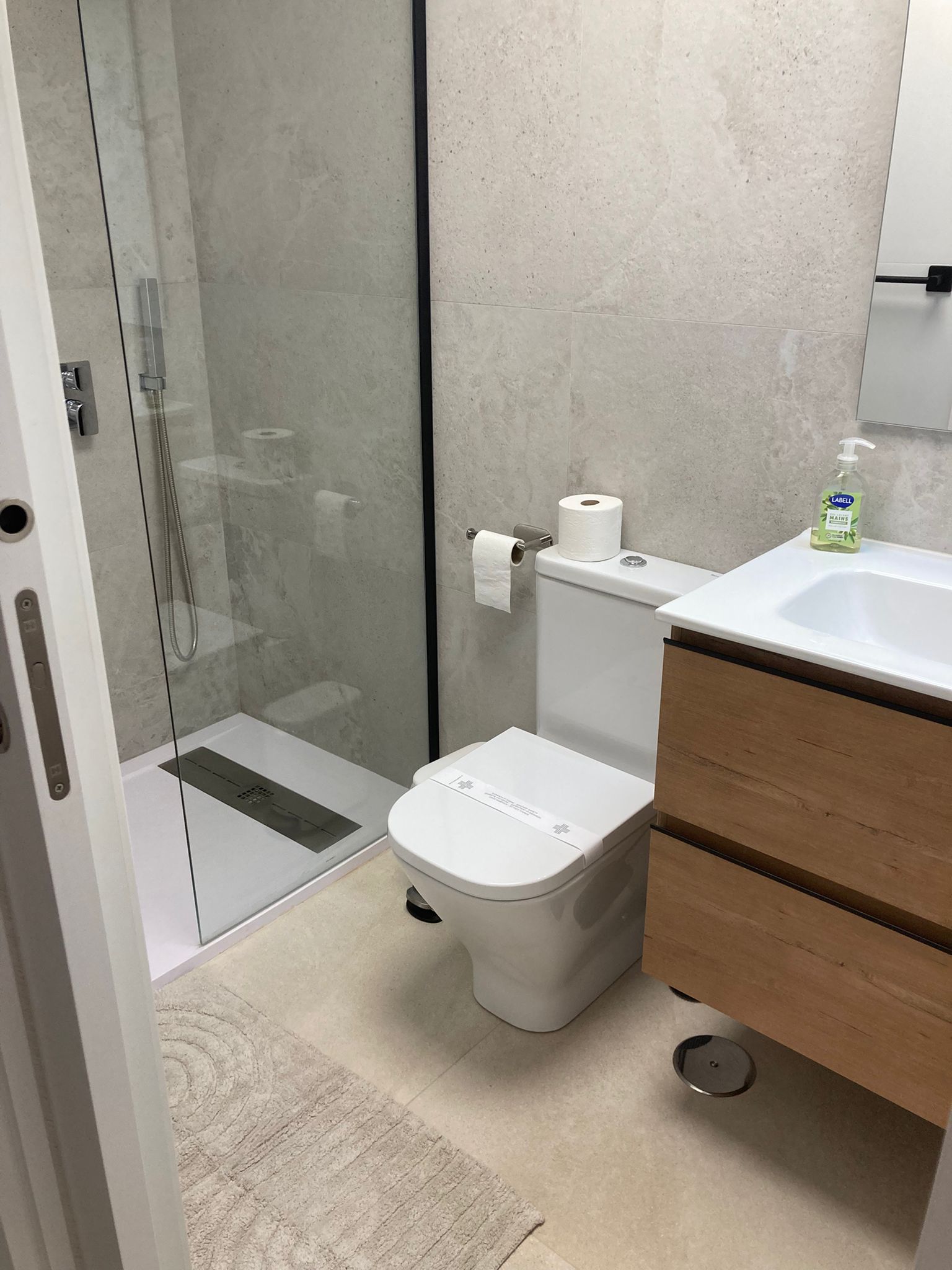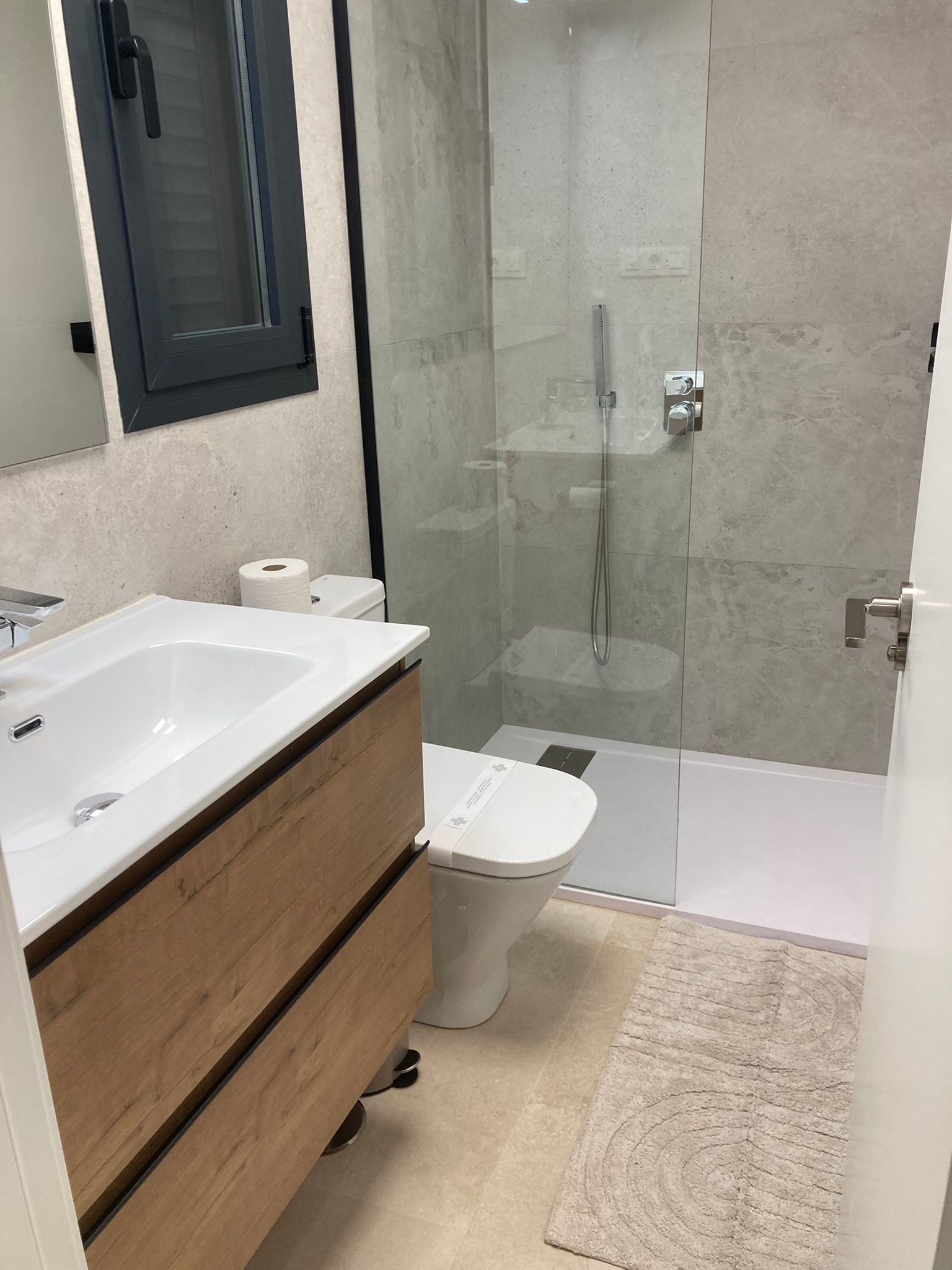 Ook de badkamer boven is modern afgewerkt en biedt alle comfort. Je beschikt over een ruime inloopdouche, regendouche, een elegante wastafel met spiegel en een toilet. Dankzij de strakke lijnen en frisse uitstraling is dit een fijne plek om je dag ontspannen te beginnen of af te sluiten.