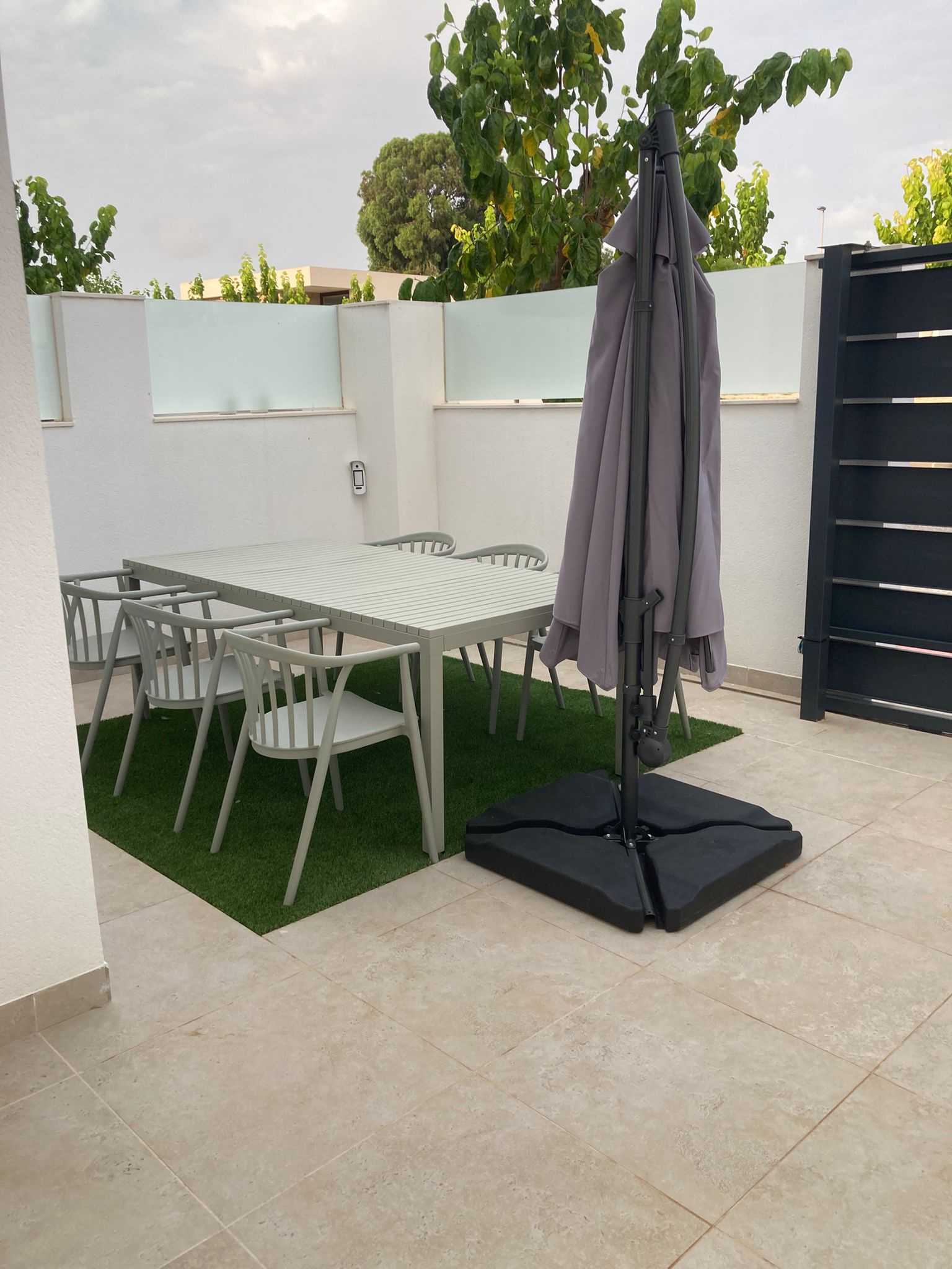 Aan de achterzijde van Casa Endamar vind je een ruim terras met een eettafel voor zes personen en een parasol voor schaduwrijke momenten. Het is de ideale plek om gezellig te ontbijten, te lunchen of te dineren in de avond.