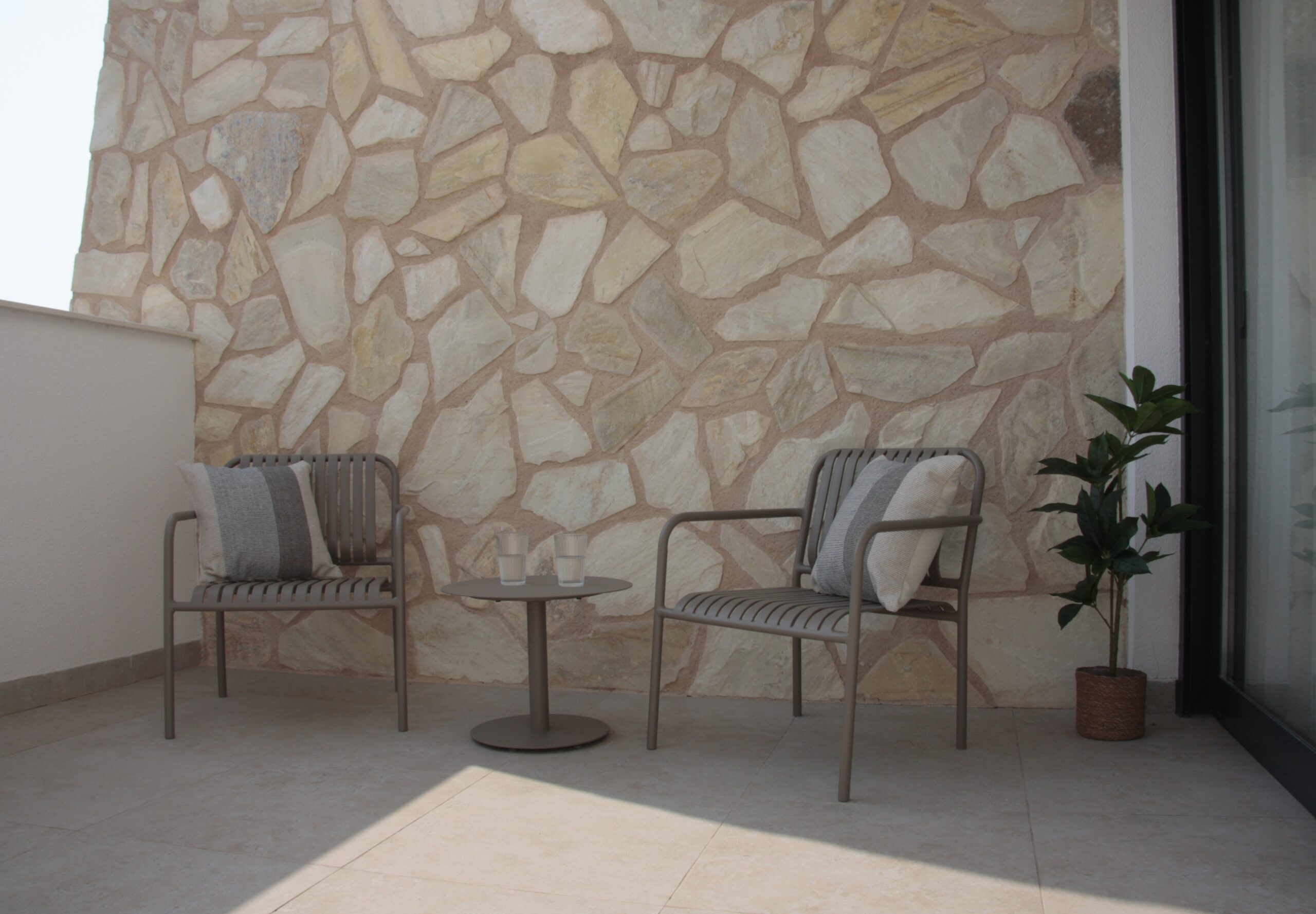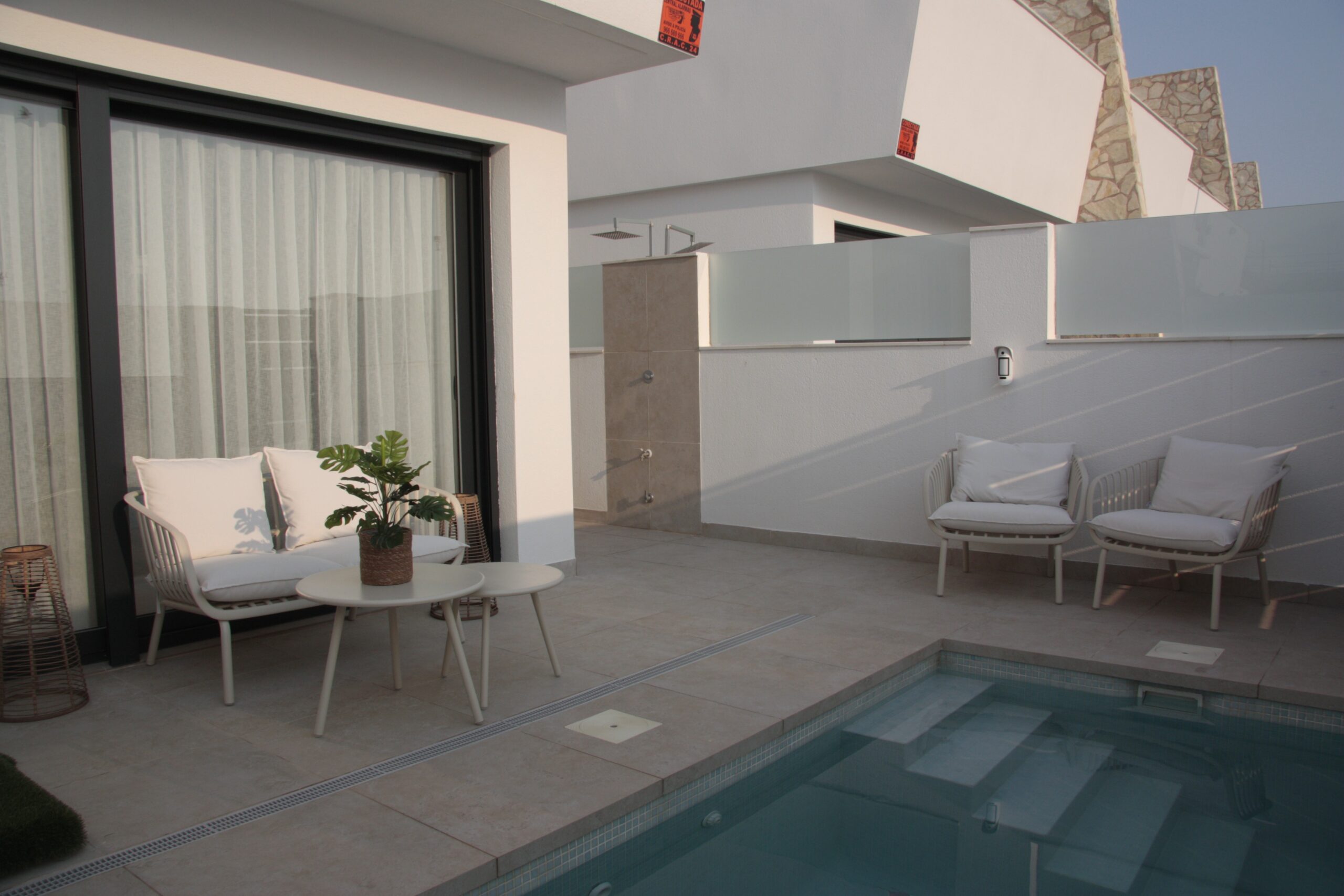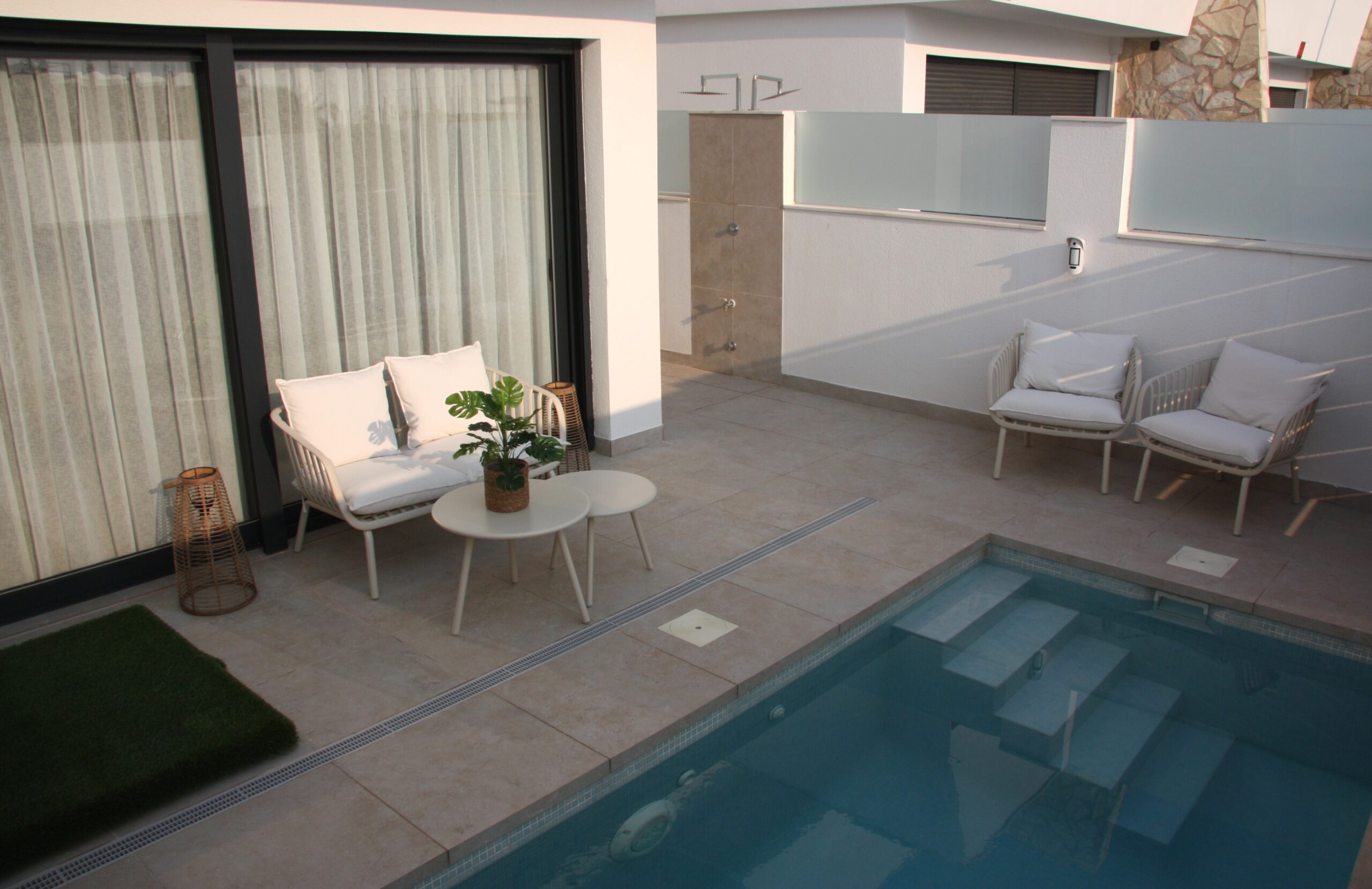 Aan de voorzijde van Casa Endamar ligt het zonnige terras met onverwarmd privézwembad van 10 m². Dit is de plek waar binnen en buiten naadloos in elkaar overgaan. In de ochtendzon is het hier heerlijk wakker worden en in de middag kunt u hier de schaduw opzoeken. Ook is een buitendouche aanwezig, waar u uzelf kunt afspoelen en afkoelen.