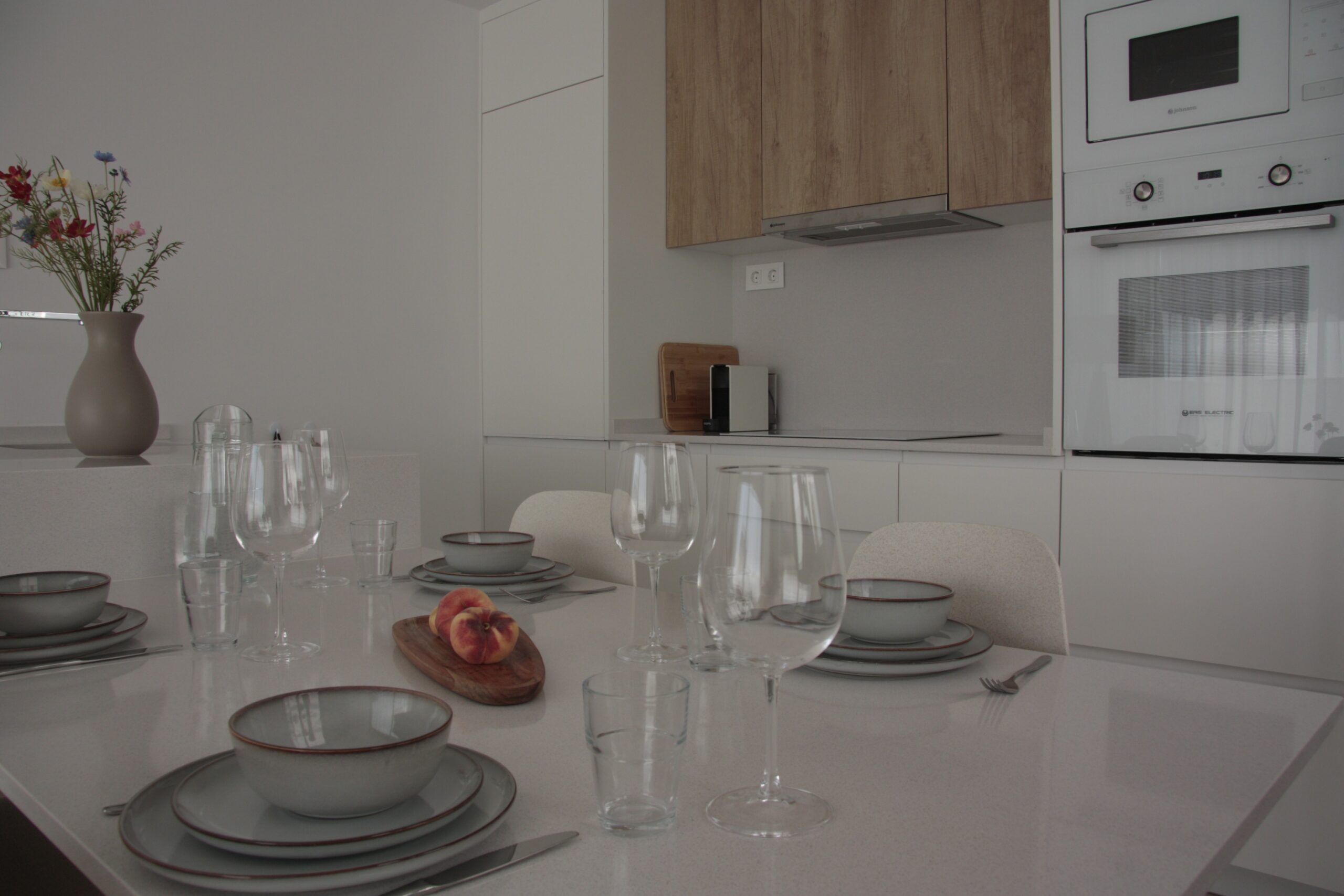 De moderne open keuken is volledig uitgerust en van alle gemakken voorzien. Hier vind je een vaatwasser, oven, magnetron, inductiekookplaat, Nespresso-apparaat en een ruime koelkast met afzonderlijke vriezer. Dankzij de open indeling blijf je altijd in contact met de woonkamer en het terras, ideaal voor gezellige maaltijden en avonden samen.
